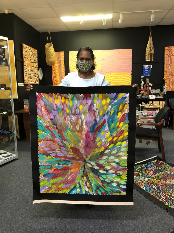 Caroline Numina is an Anmatyerre artist and one of six sisters and three brothers who lived at Ti Tree, 190km North of Alice Springs in Central Australia. Her mother is Barbara Mbitjana (Other names: Pananka or Price). She attended primary school at Stirling Station, a cattle station near Tennant Creek where she began painting at a young age, taking guidance from her world famous aunties Gloria and Kathleen Petyarre. She later studied at Yirara College in Alice Springs. After her studies, she returned to Stirling Station working with the Community Development Program. In 2000 the Numina family moved to Darwin where they still live today.